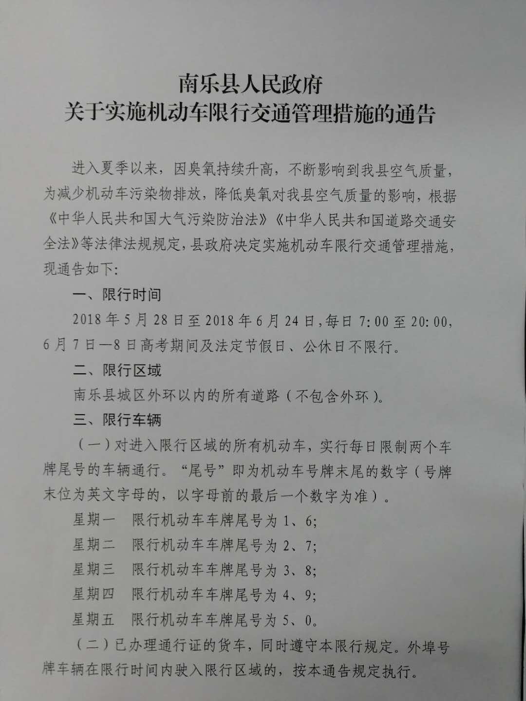 南樂縣人民政府關于實施機動車限行交通管理措施的通告