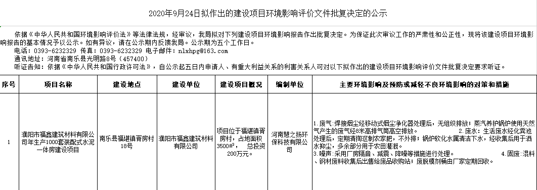 2020年9月24日擬作出的建設項目環境影響評價文件批復決定的公示